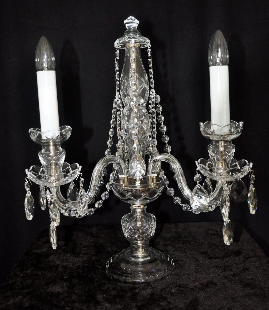La lampe de table traditionnelle en cristal tchèque avec trois bras en verre. Finition en métal argenté.