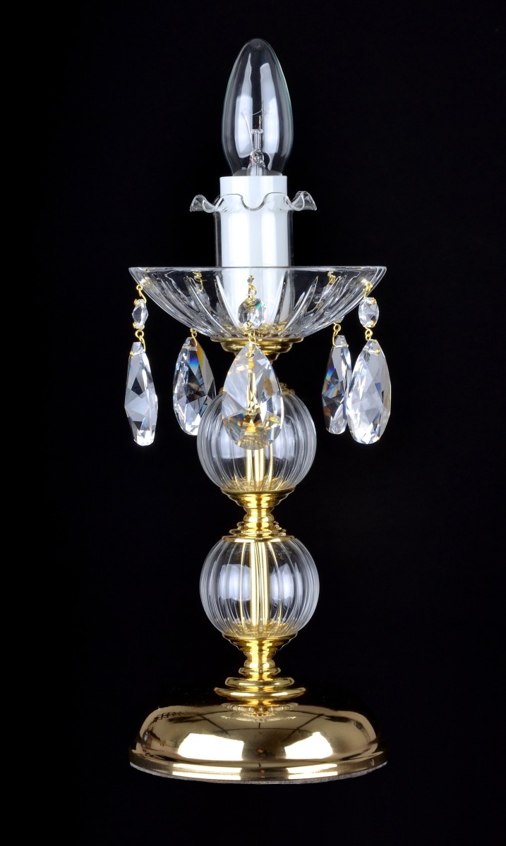 Lampe de table simple en laiton doré moulé à la main et décoré d'amandes en cristal. Un petit éclairage pratique pour un intérieur résidentiel.
