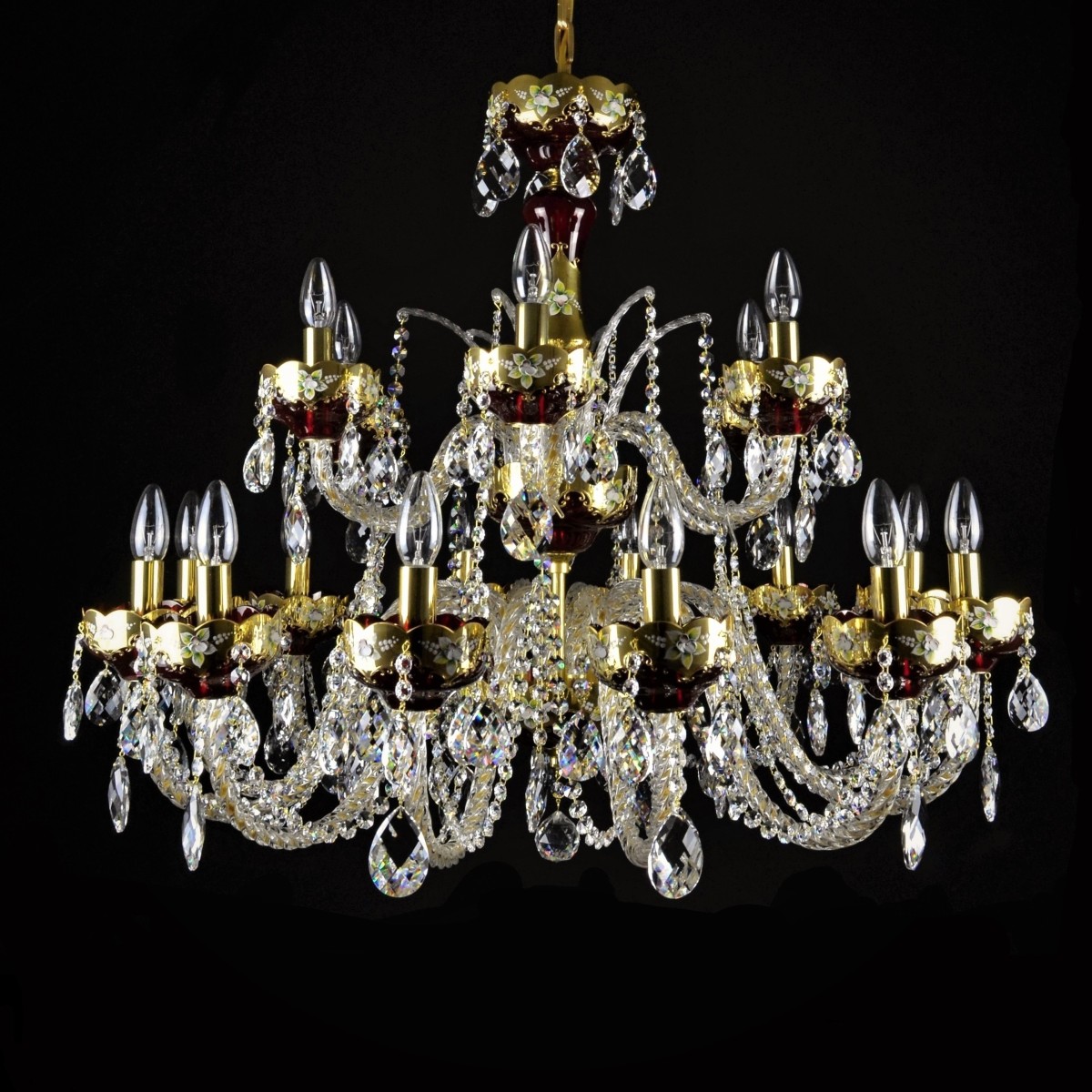 Le verre rubis est soufflé à la main. Le lustre en cristal est décoré d'une peinture à la main émaillée, de 12 (8+4) bras en verre sur deux niveaux.
