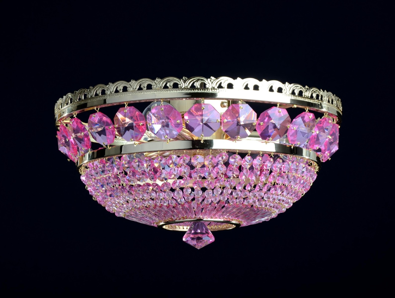 Lustre en cristal à panier avec 3 ampoules en applique avec de grands octogones fuchsia taillés - Laiton doré