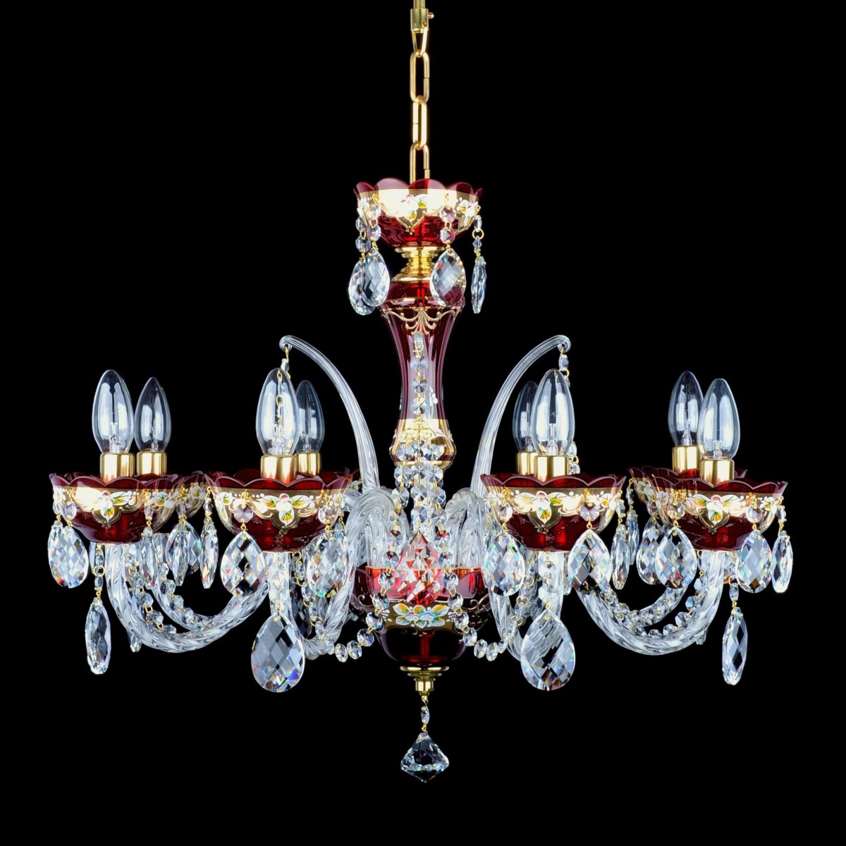 Lustre traditionnel en rubis avec huit bras torsadés, coins en verre, décoré d'amandes en cristal et d'une pyramide en cristal. Le verre rouge foncé est décoré de peintures à la main et de fleurs en émail haut de gamme (verre finement broyé avec de l'oxyde métallique fondu dans un four). Ces lustres à la couleur rouge rubis distinctive conviennent particulièrement au salon, auquel ils apporteront chaleur et confort. Un lustre rubis plus petit convient également à la chambre à coucher, pour créer une atmosphère romantique pour les couples. Les lustres rubis plus grands décorés d'or conviennent également à des établissements tels que les salons de coiffure de luxe, les pâtisseries, les épiceries fines, etc.