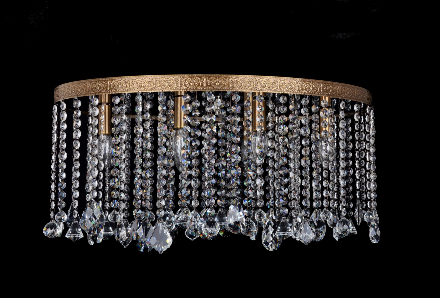 Garnitures : Chaînes de strass (32% PbO), boules de cristal taillées, pendeloques, amandes, cristaux en forme de diamant (motif Preciosa ®).